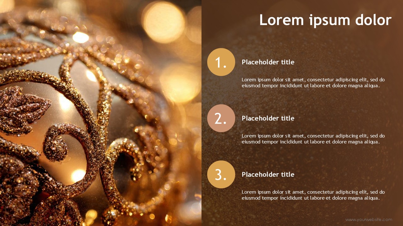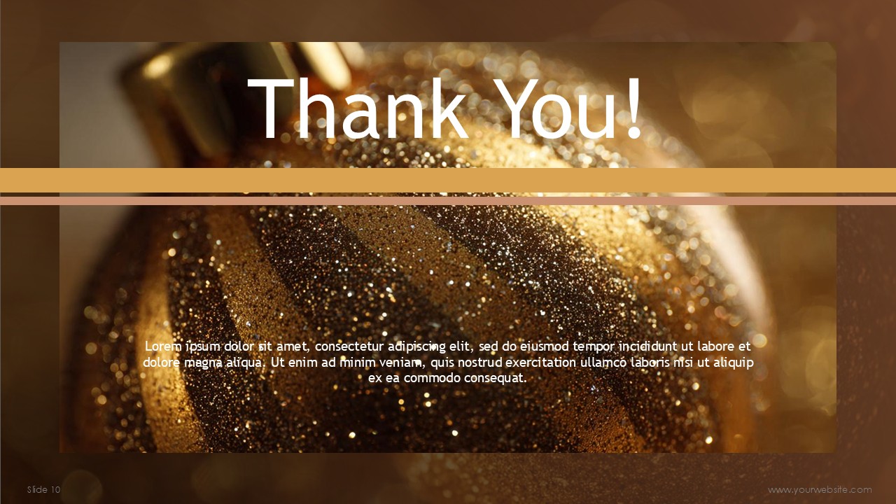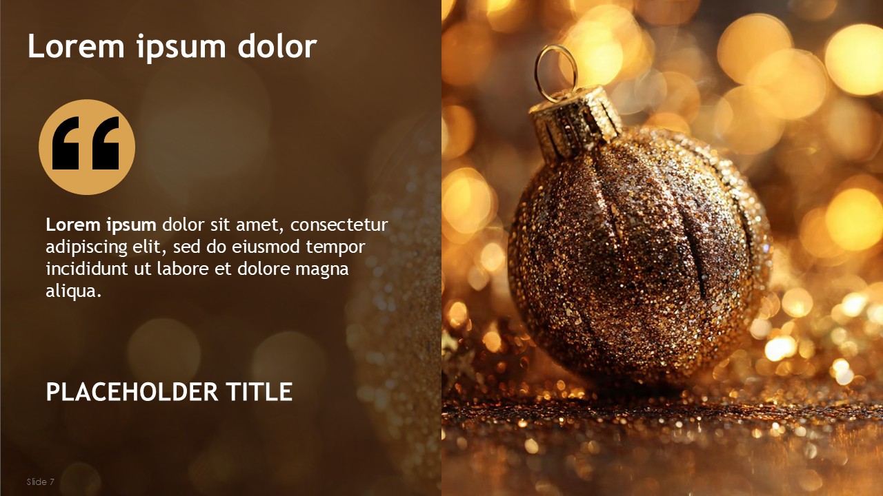 With a combination of earthy rich brown and bright yellow for celebrations, the warm color strategy promotes stability and reliability, and also an upbeat, joyous nature that brings in cheerful brightness. The Modern Holiday Greetings Free Presentation Template incorporates the warm and contemporary color harmonies; with the bronze focal color and light golden effects, users are guided through the content in a cohesive, polished, and professional way.