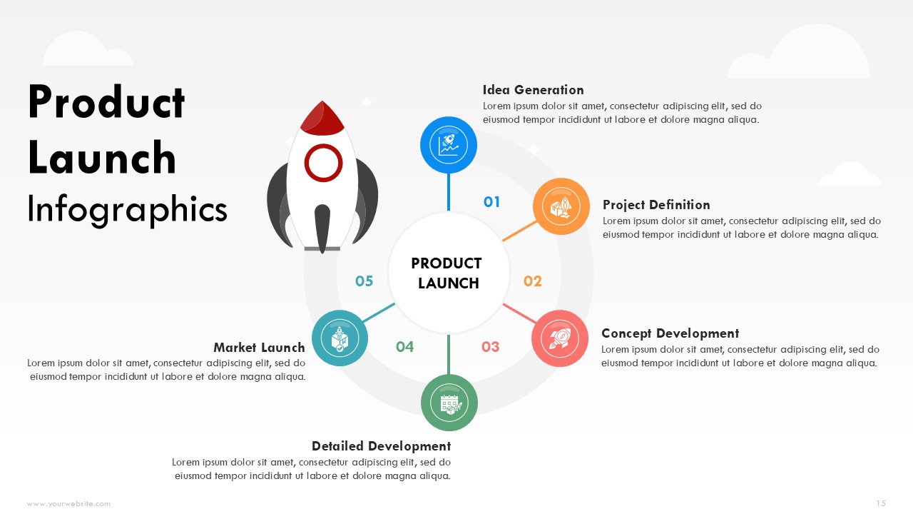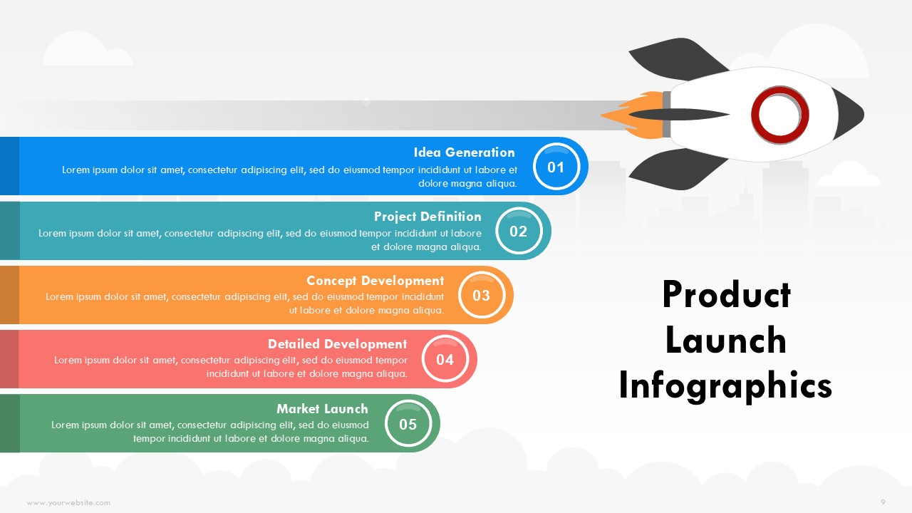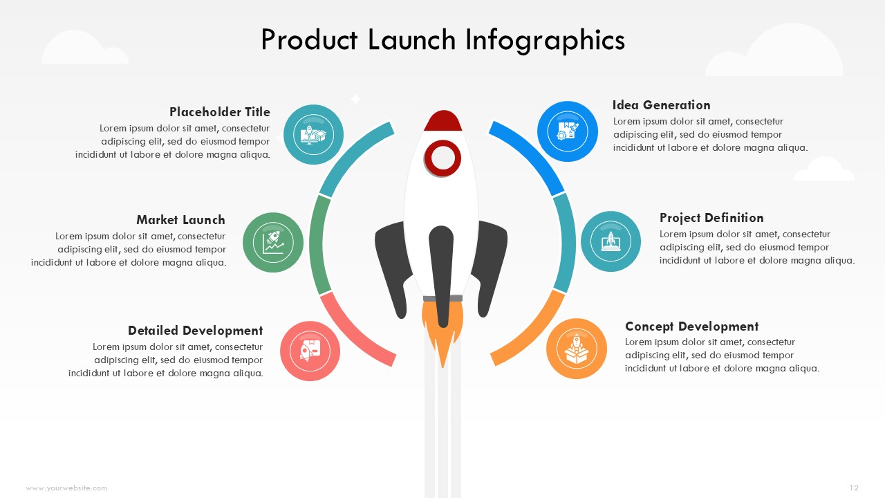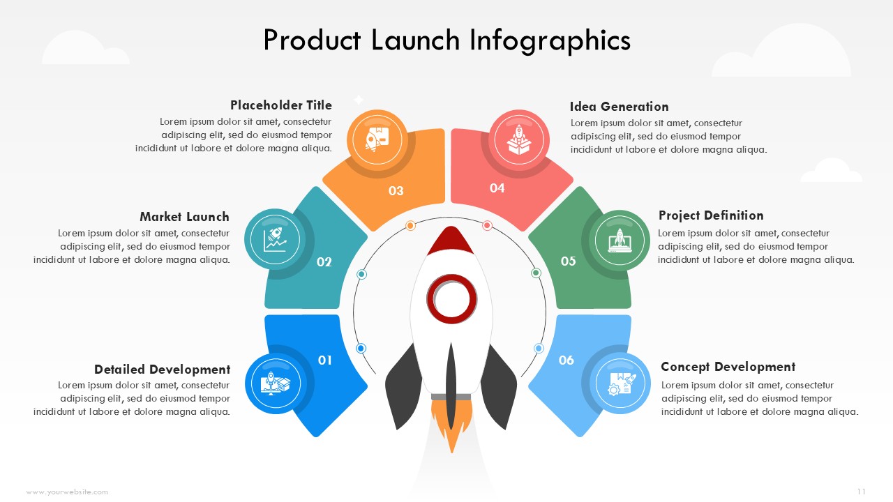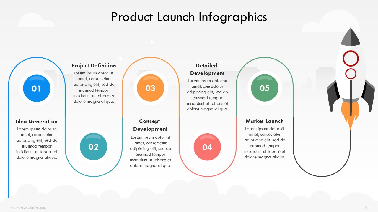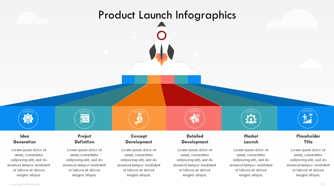 Downloading the Product Launch Infographics PowerPoint Template. Fragmented plans are replaced with a cohesive visual arsenal that turns internal teams into launch commandos, execs into believers, and markets into fervent followers, strategically colored slide after strategically colored slide.
