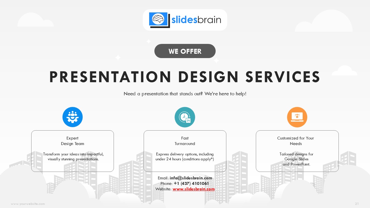 Looking for a slide or PPT that’s uniquely yours? Our presentation design agency is here to help make your ideas a reality. As a leading presentation design company, we focus on delivering premium-grade bespoke presentations that engage your audience and ensure message retention. Kindly get in touch with us for professional custom presentation design services and transform your brand’s message for the purpose that you have in mind.