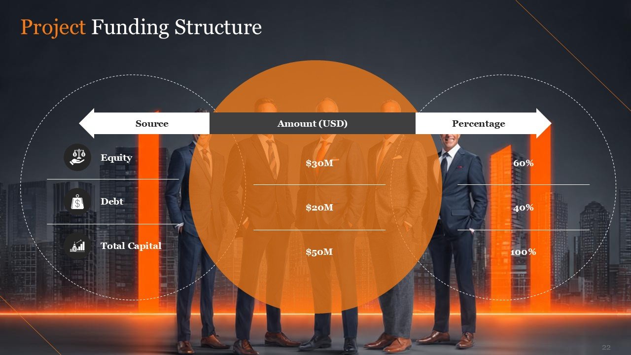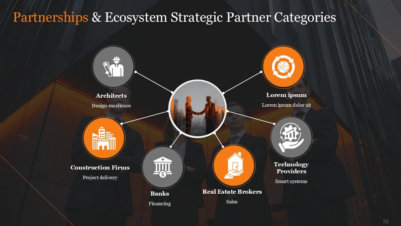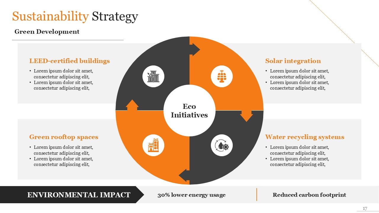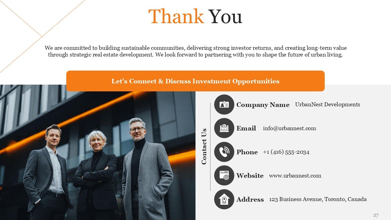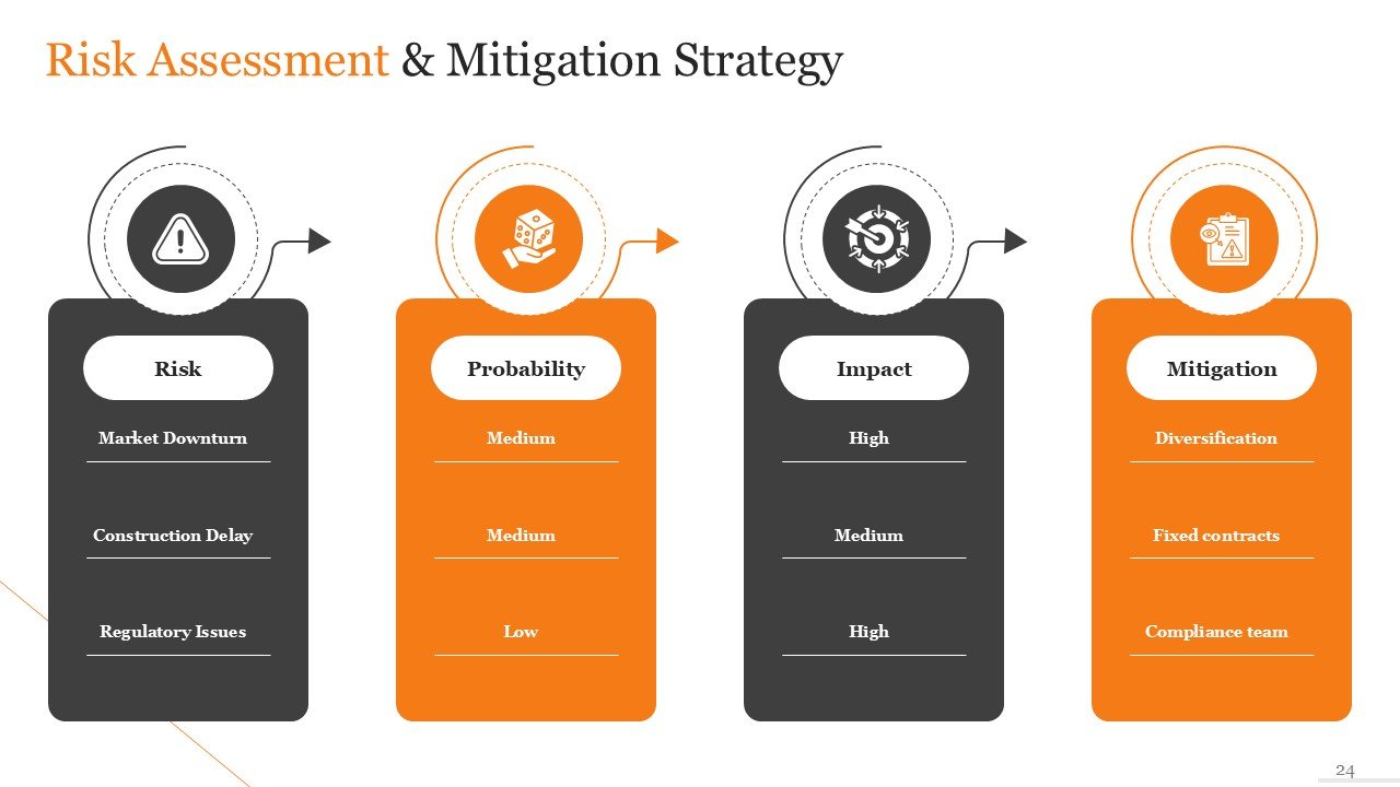 The Real Estate Pitch Deck PowerPoint Presentation Template can be utilized to make a bold and highly customizable stain on a competitor’s reputation. Using a premium combination of black and orange colors provides a sleek and clean aesthetic. Showing images of buildings gives a high-end background for everything that refines visually strong association with the idea of property investment and development.
