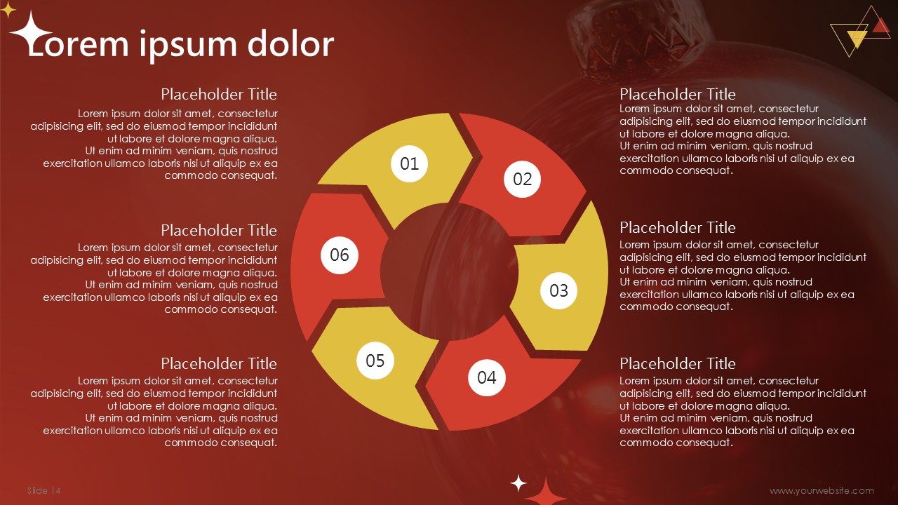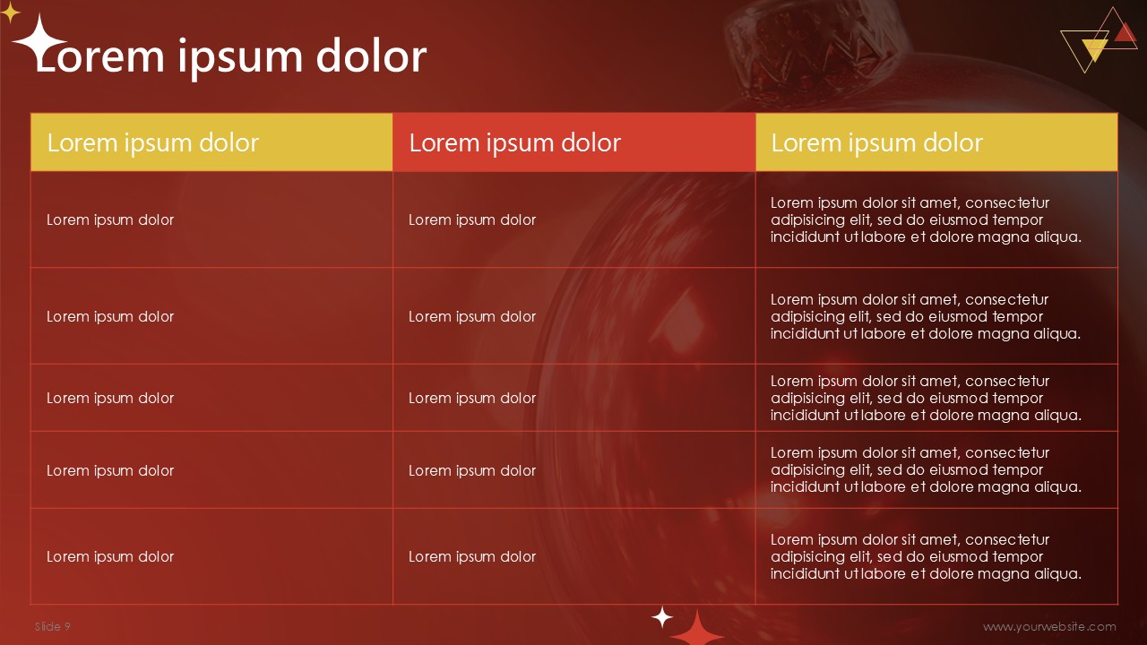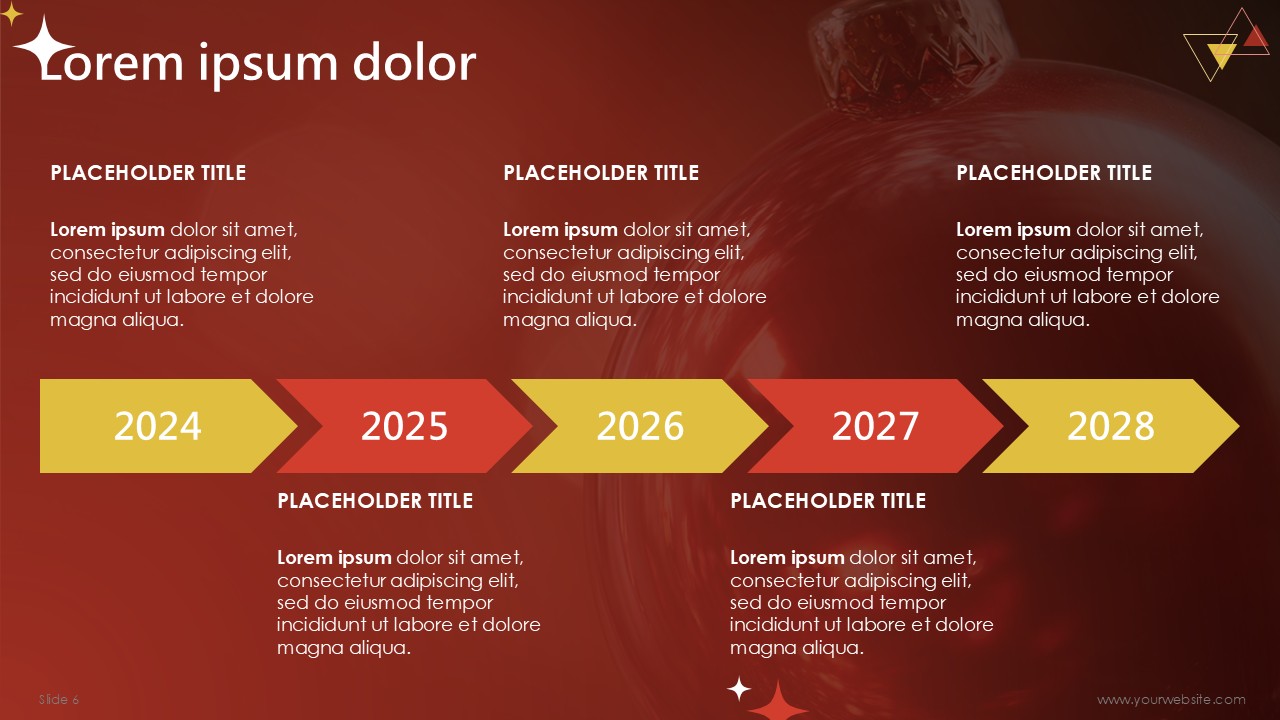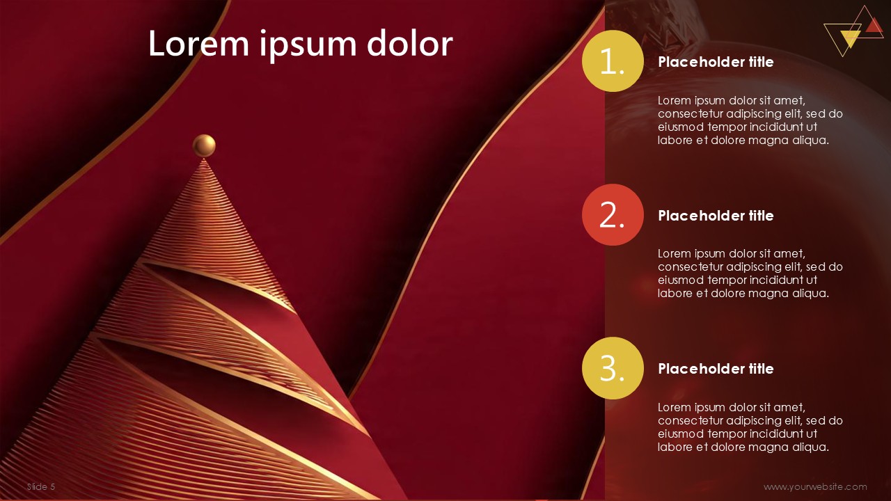 The Red Minimal Christmas Abstract Free PowerPoint Template is an uncompromisingly simple yet beautifully crafted and perfectly designed Christmas-themed PowerPoint Template for the holidays, consisting of a total of 17 slides, each having a unique creativity tailored for the holidays and creating a Christmas mood. This is a red and yellow PowerPoint Template with a unique and abstract Christmas tree with geometric shapes and artistic moderation that perfectly sustains the essence of Christmas and the holiday season. This PowerPoint Template is designed to offer the highest degree of sophistication for the holidays, perfect for holiday communications, corporate celebrations, and presentations for the holidays that focus on the approach of editorial sophistication.