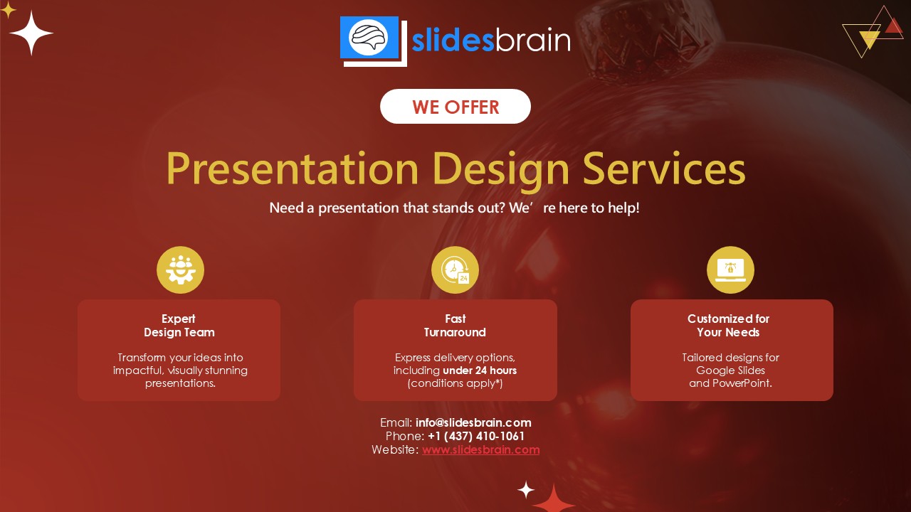 Looking for a slide or PPT that’s uniquely yours? Our presentation design agency is here to help make your ideas a reality. As a leading presentation design company, we focus on delivering premium-grade bespoke presentations that engage your audience and ensure message retention. Kindly get in touch with us for professional custom presentation design services and transform your brand’s message for the purpose that you have in mind.