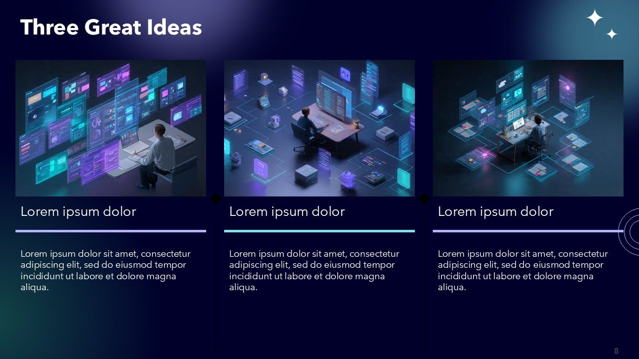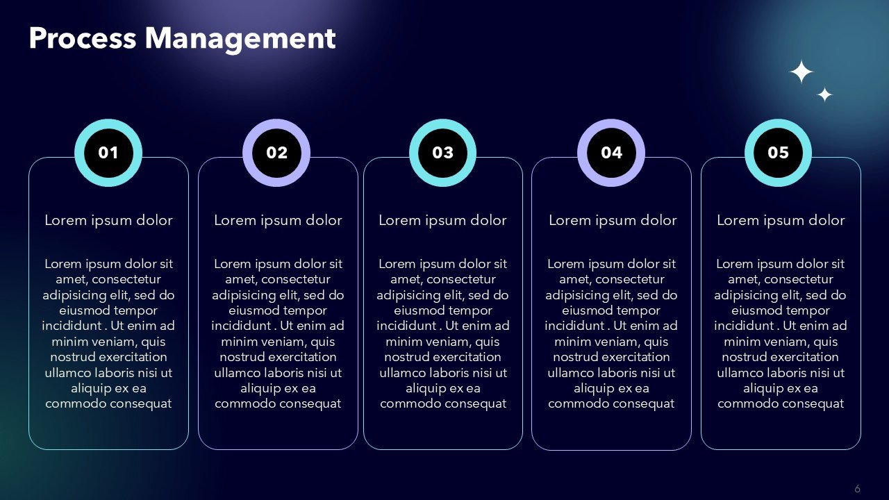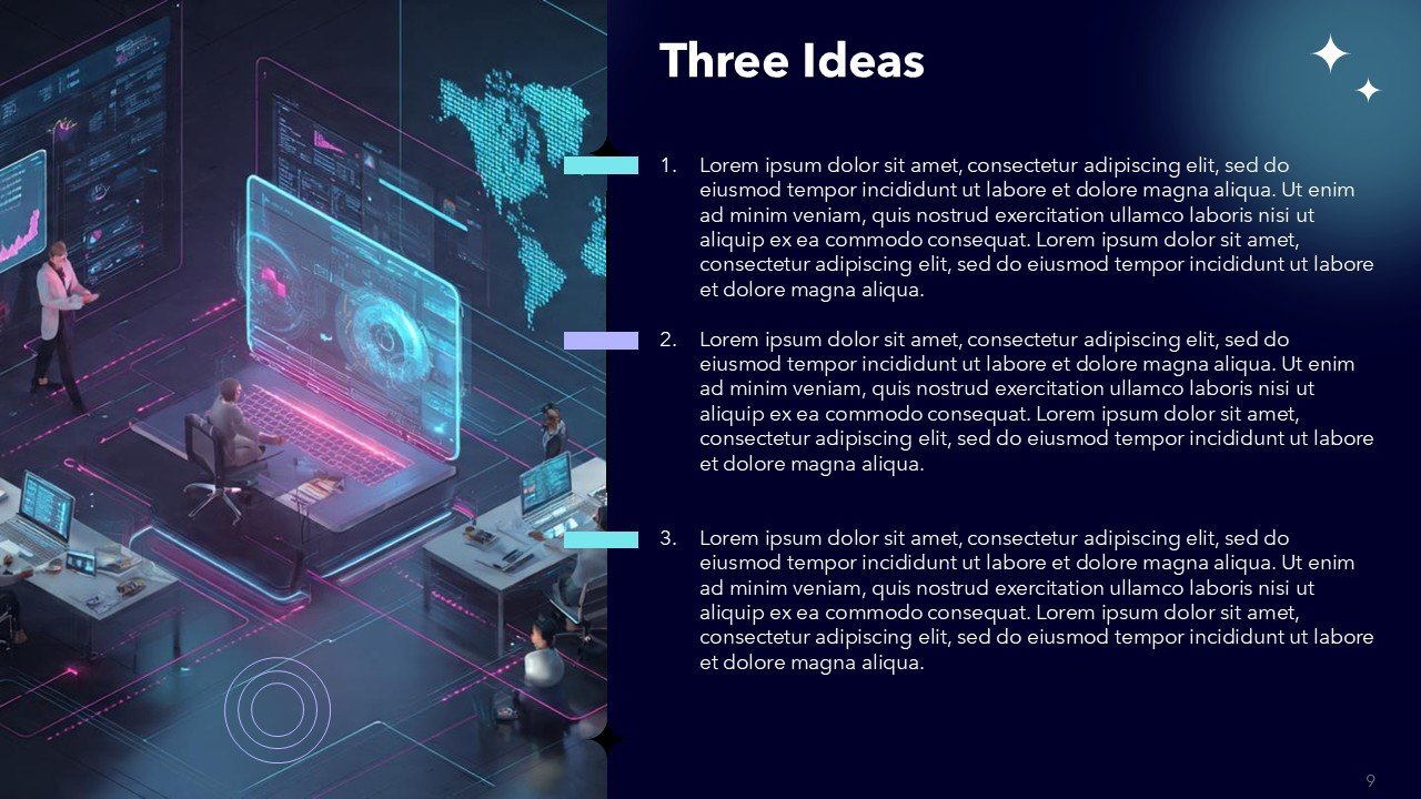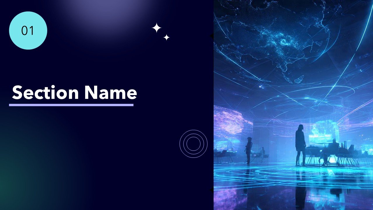 - Modern black, purple, and cyan color scheme