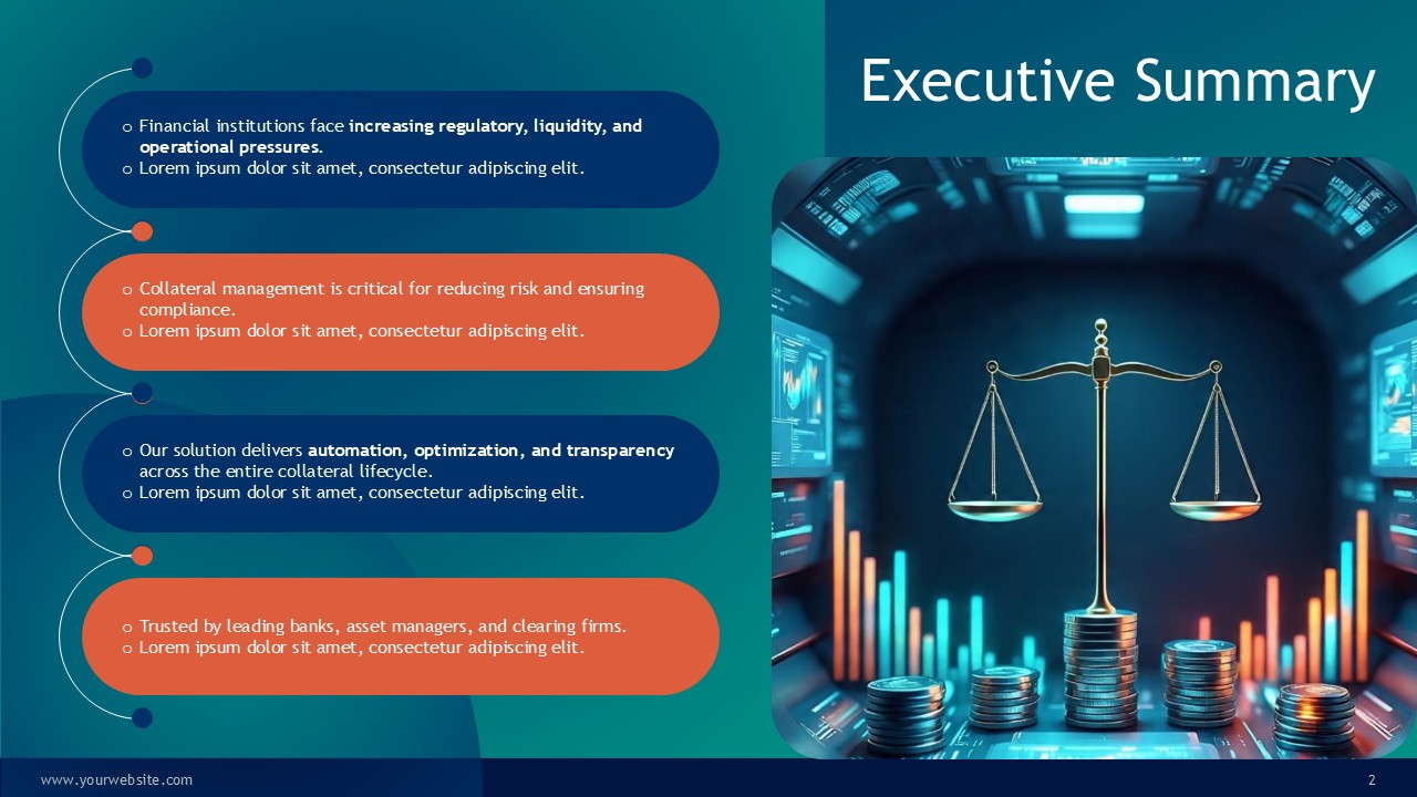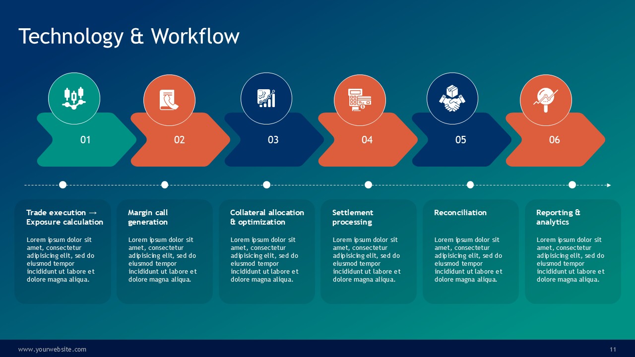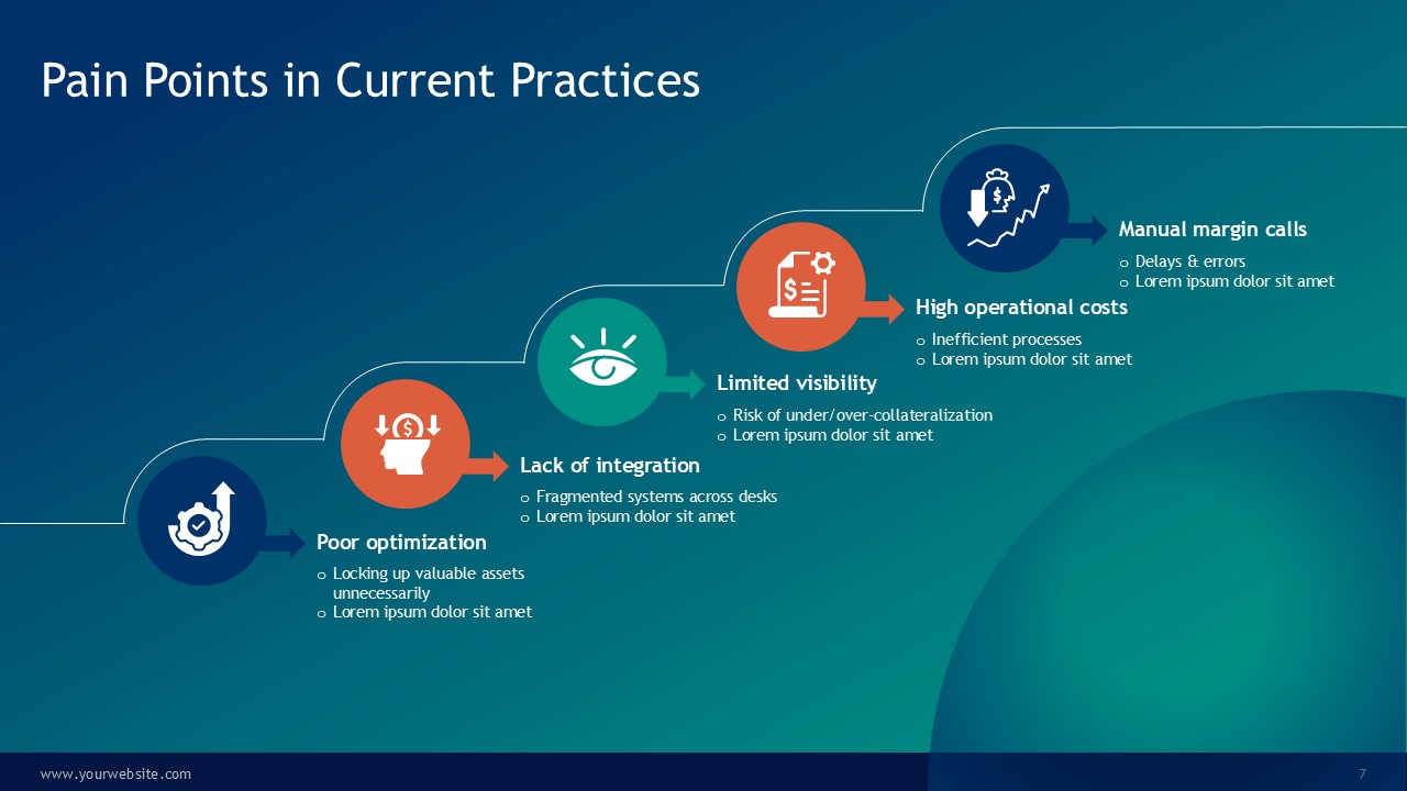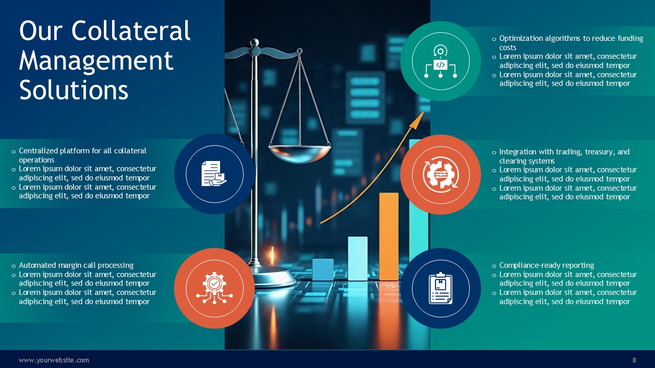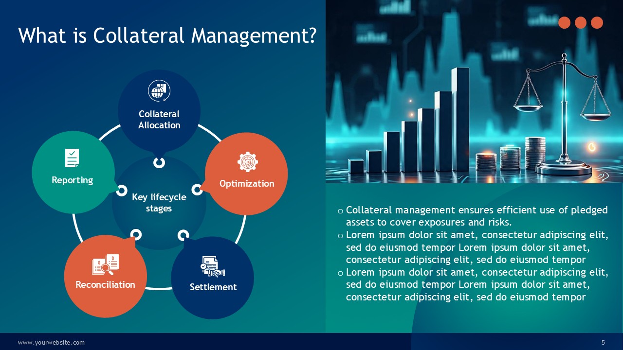 The presentation slides are decorated with modern designs having gradient backgrounds which helps in adding depth to the presentation and cleanliness, fast layouts which help the presentation avoid clutter. Flowing shapes help to guide attention and arrange the content in a way that is easier to understand. The end product is a presentation with great visual appeal and complex topics that are easier to understand are improved. The topics include exposure management, workflow operations, asset eligibility, regulatory requirements, collateral optimization, and margining.