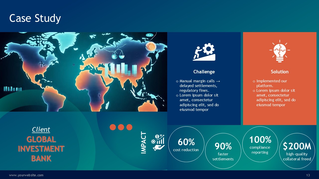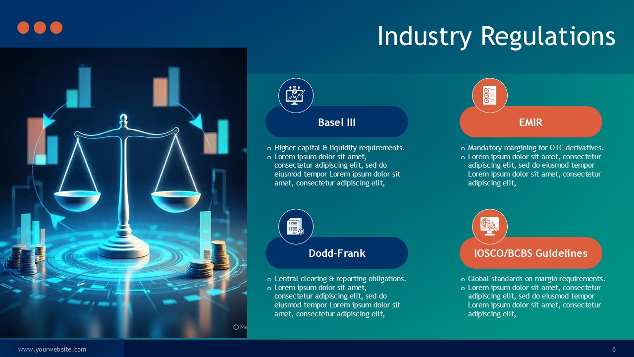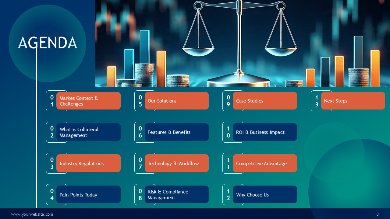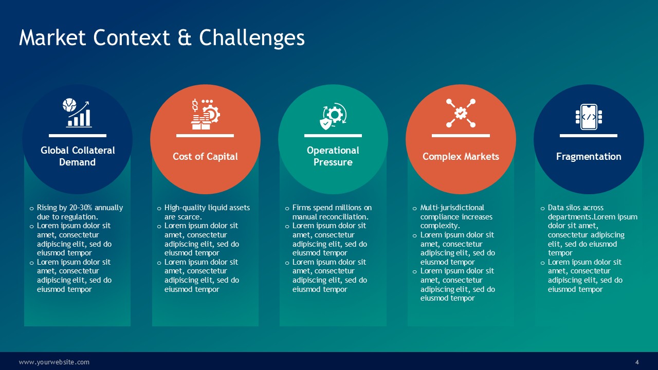 The presentation slides are decorated with modern designs having gradient backgrounds which helps in adding depth to the presentation and cleanliness, fast layouts which help the presentation avoid clutter. Flowing shapes help to guide attention and arrange the content in a way that is easier to understand. The end product is a presentation with great visual appeal and complex topics that are easier to understand are improved. The topics include exposure management, workflow operations, asset eligibility, regulatory requirements, collateral optimization, and margining.