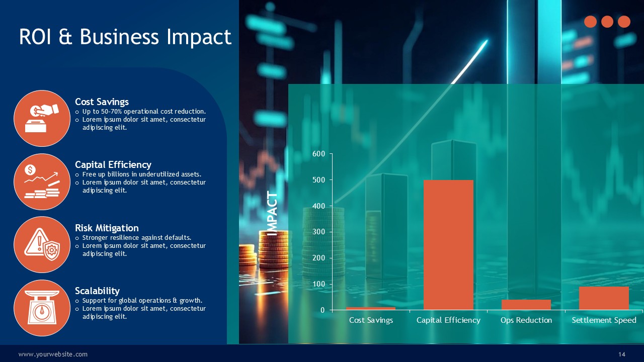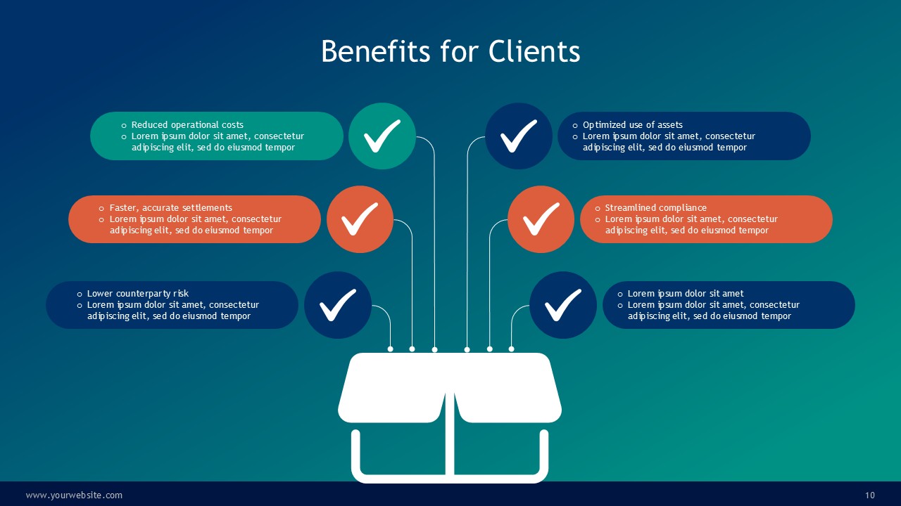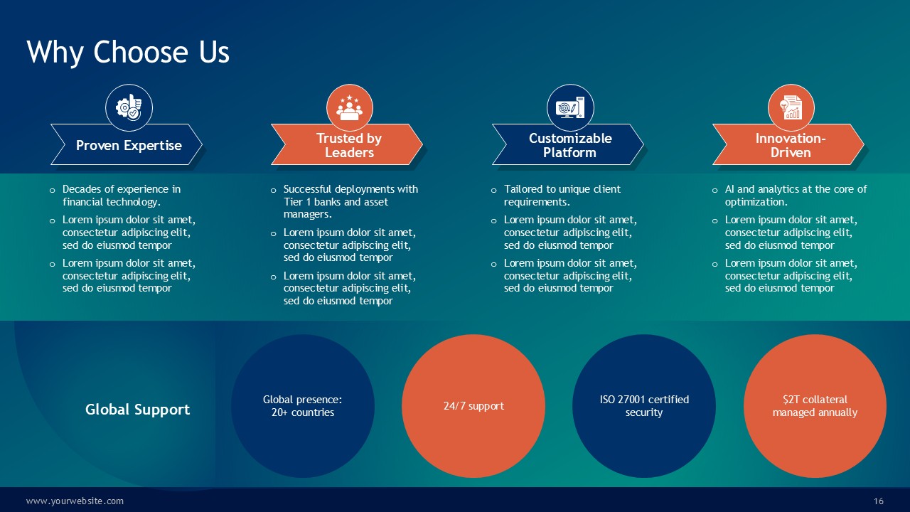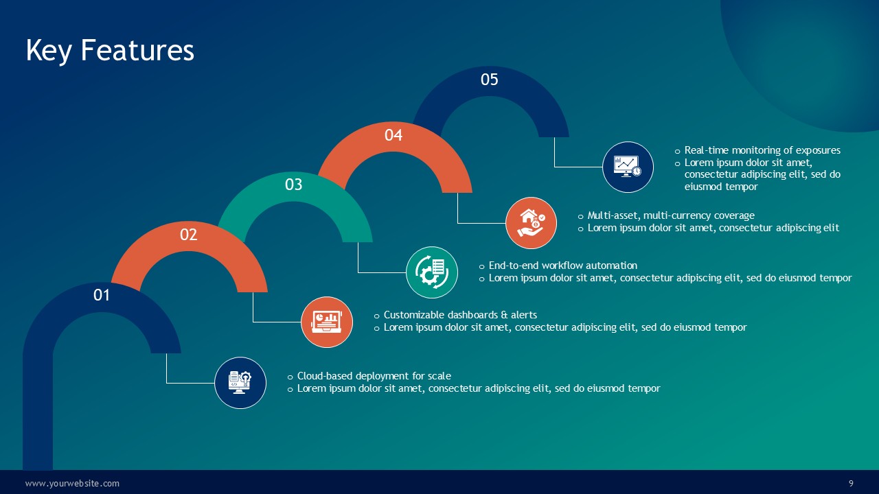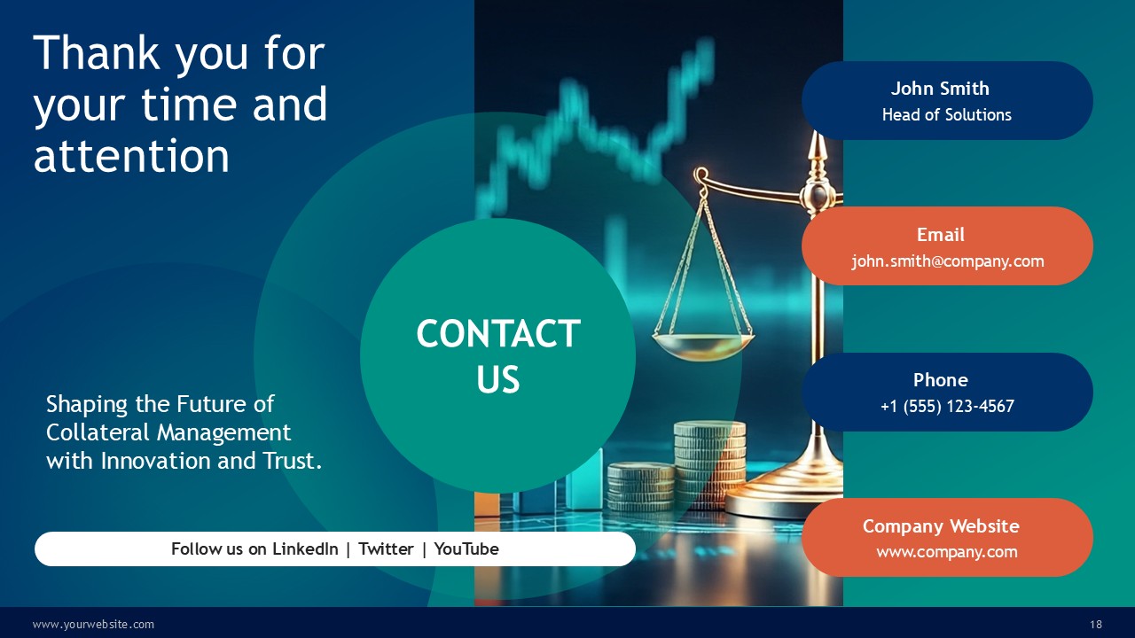 The presentation slides are decorated with modern designs having gradient backgrounds which helps in adding depth to the presentation and cleanliness, fast layouts which help the presentation avoid clutter. Flowing shapes help to guide attention and arrange the content in a way that is easier to understand. The end product is a presentation with great visual appeal and complex topics that are easier to understand are improved. The topics include exposure management, workflow operations, asset eligibility, regulatory requirements, collateral optimization, and margining.