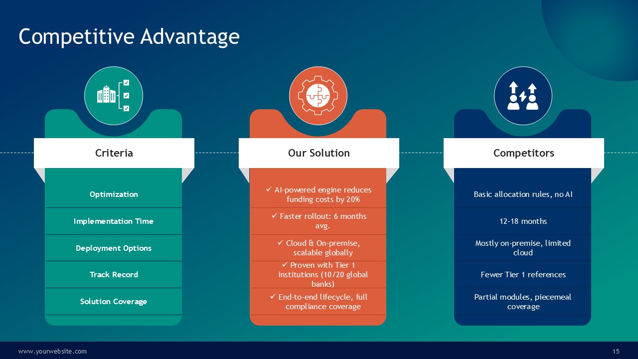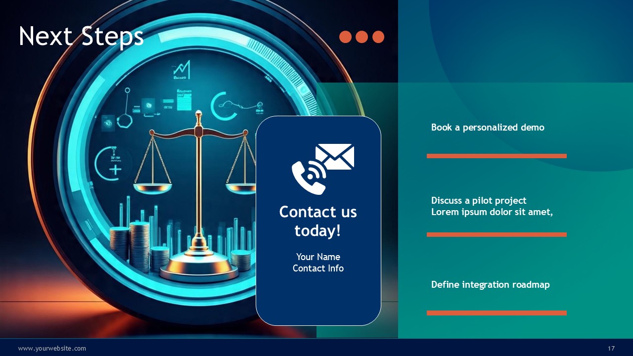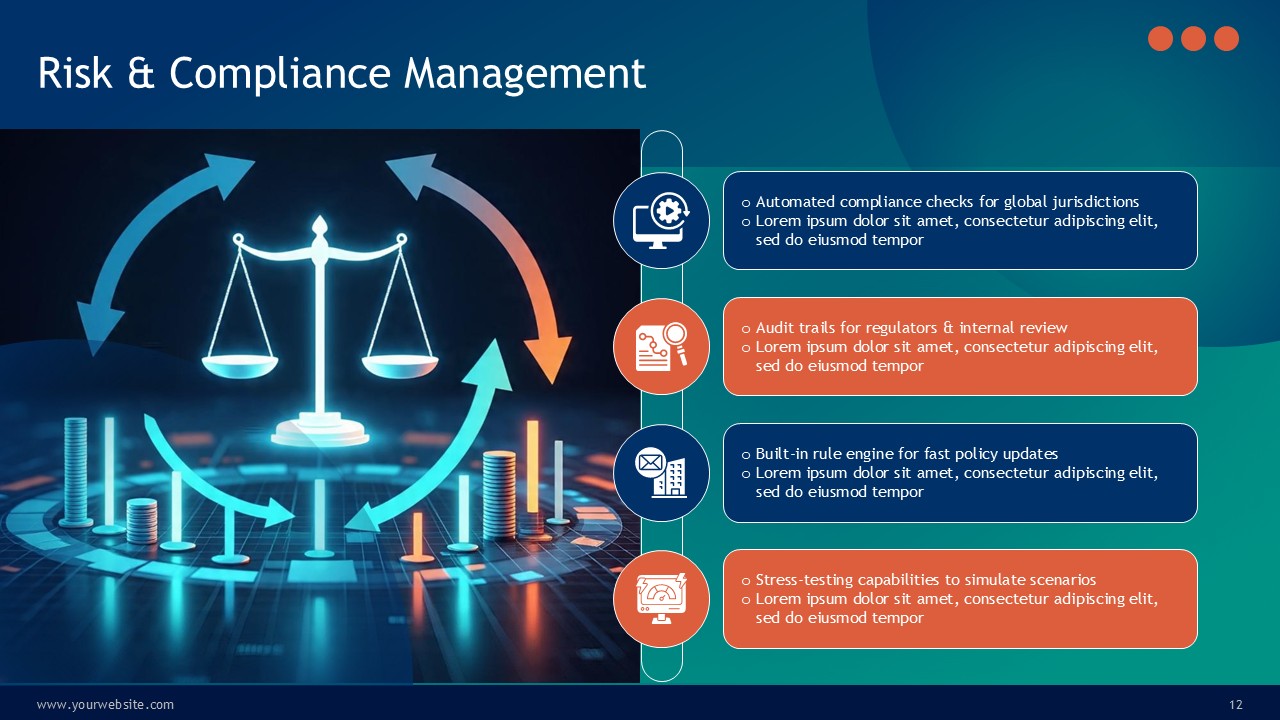 The enhancement of the presentation is best portrayed through the color scheme of sharp blue, green, and orange. The presence of blue helps to portray a sense of professionalism and competence. On the other hand, green helps in symbolizing financial balance, compliance, and good health. The presence of orange in a color scheme assists in obtaining the value of urgency and helps users pay attention to important risk zones.