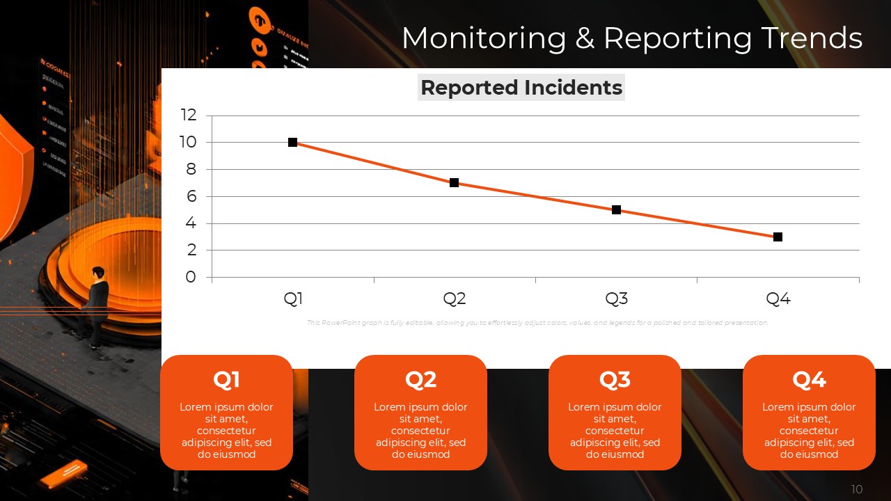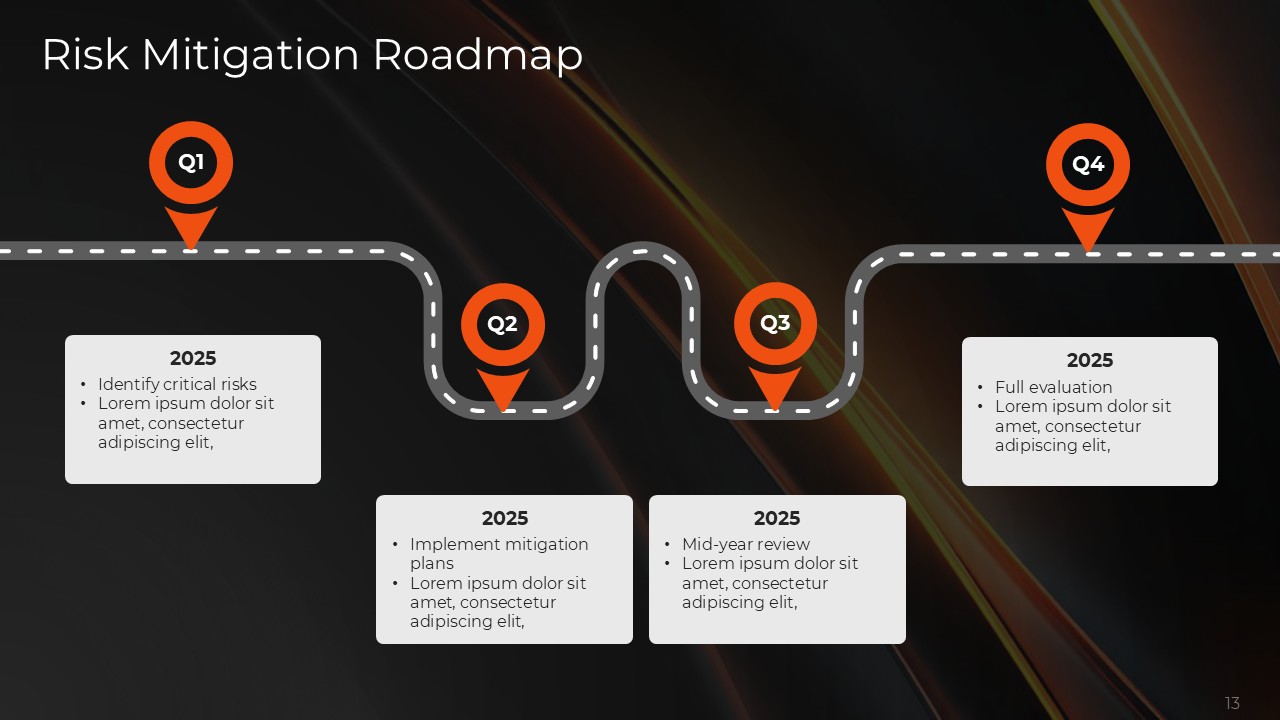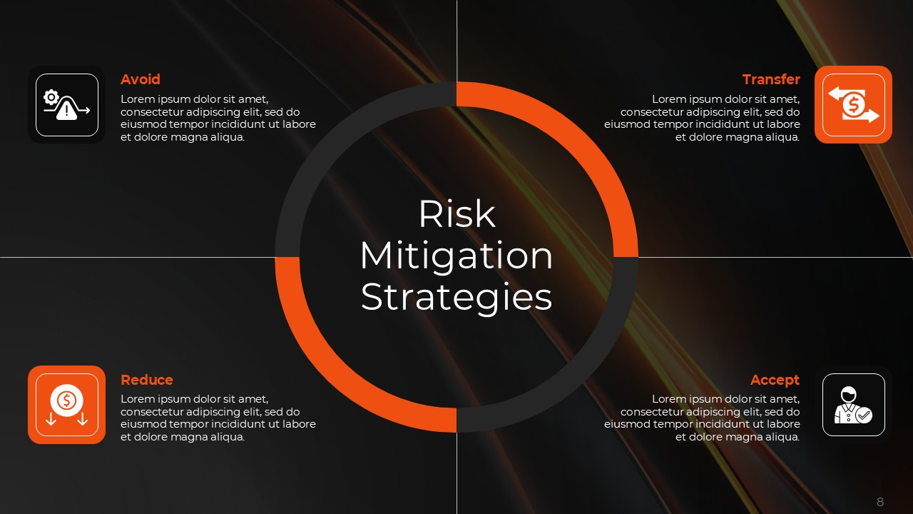 The balanced and contrasting color scheme of orange and black works with psychological accuracy throughout the Risk Mitigation and Management Plan for Business Resilience PPT Template, with black representing authority, stability, and methodical approach and orange representing urgency, alarm, and priority interventions. Together, this color combination has enough visual strength to guide the eye to the focus of the content, the key actions and actions while still preserving the professional reputation needed for adequate communication about the risk of the stakeholders.