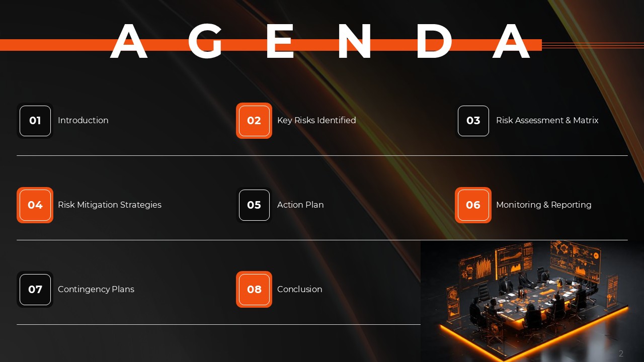 The Risk Mitigation and Management Plan for Business Resilience PPT Template is an elegant and professional 19-slide template that simplifies complex risk scenarios and arms them with actionable resilience strategies. The stark template is done in deep solid black and vibrant alert orange, punctuated with an abstract image as the template cover that suggests the clash of tactic and threat countered in control. The Risk Mitigation and Management Plan for Business Resilience PPT Template allows risk officers, business continuity managers, and other corporate leaders to provide risk strategies to top company executives, board members, and other stakeholders with confidence and clarity, arms them with the sophisticated template structure they appropriately need.