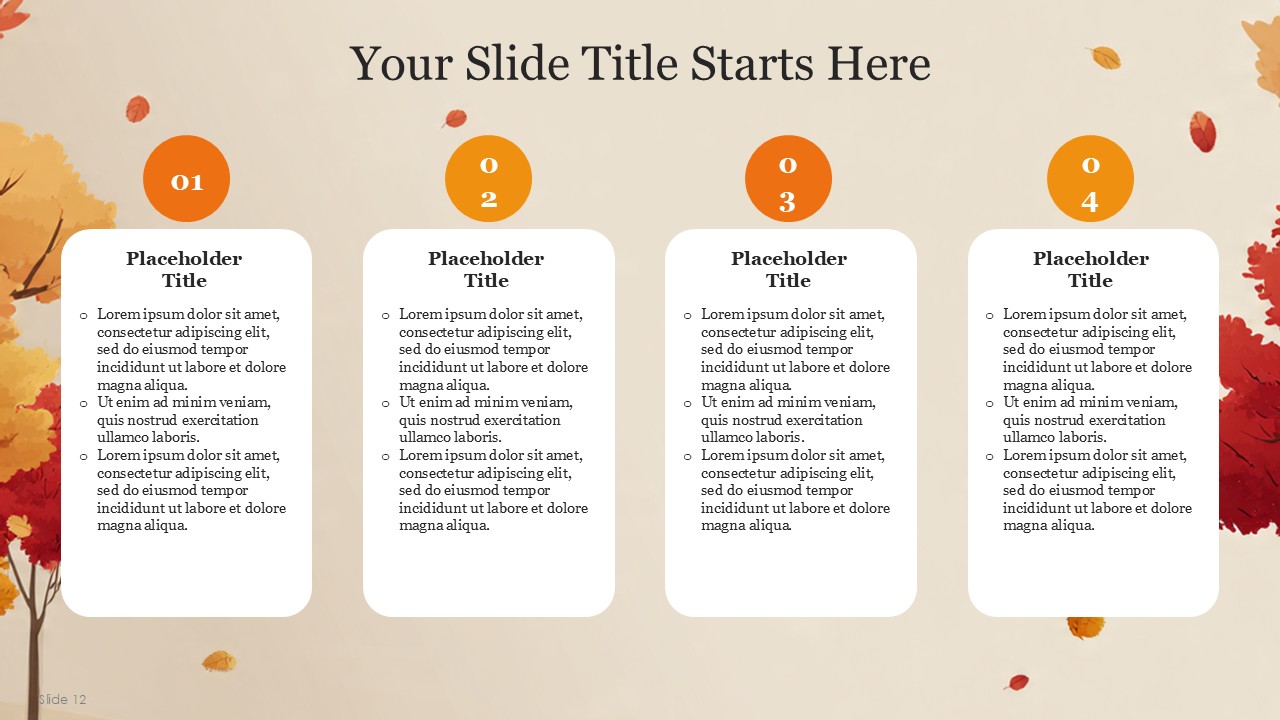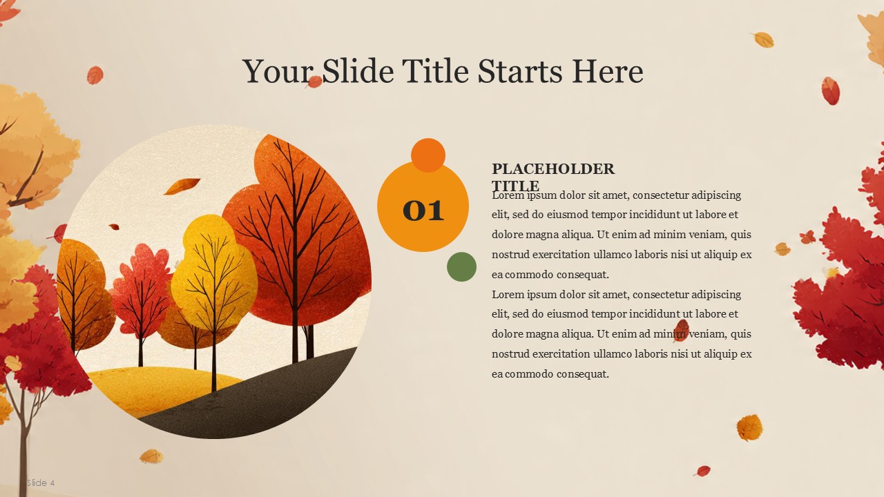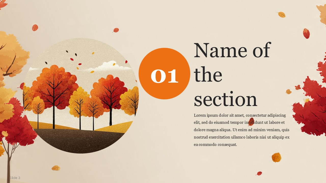 The simplistic and customizable nature of the template is the primary factor for the wide use of the template for educational and business presentations. The Autumn template combines clean, functional design with seasonal design allowing for accurate and effective autumn theme presentations. The Autumn PowerPoint Template makes creating classroom presentations, community presentations, corporate event presentations, and even family get togethers as easy as a few clicks and slides. Autumn events, seasonal information and reports, and quarterly reports can be presented with warm additions and the slides will keep to their professional and cozy look.