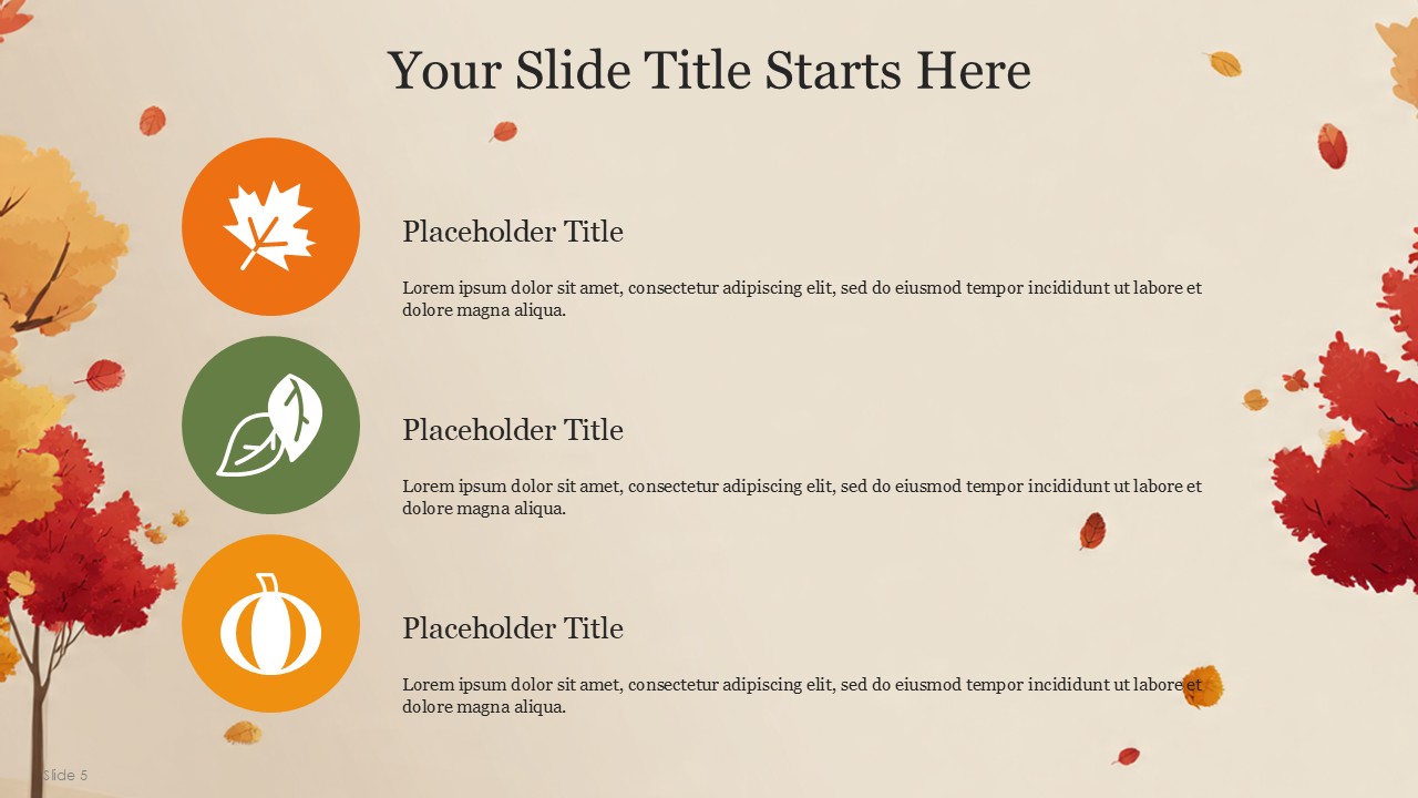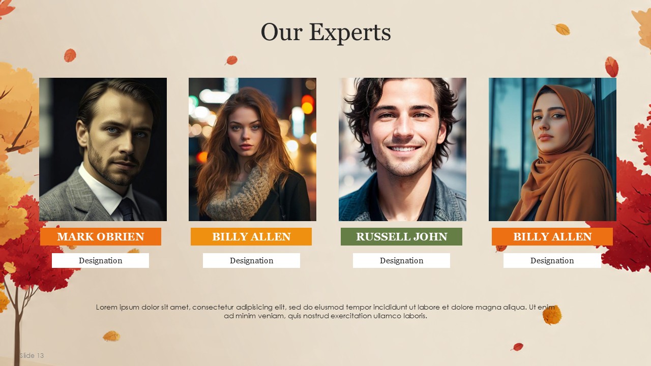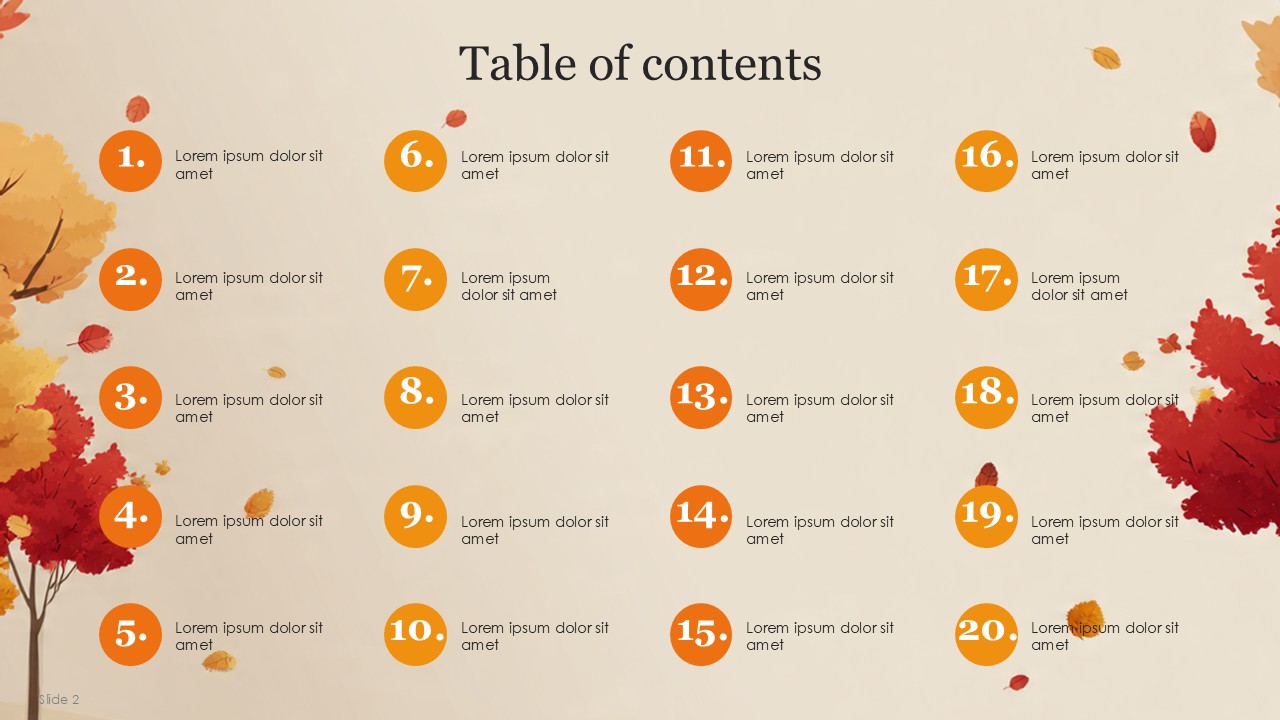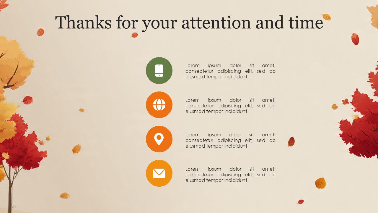 The Autumn PowerPoint Template comes with 20 slides which incorporates the vibrant autumn colors with a professional yet cozy design which balances the orange, yellow, green, and cream palette of autumn. This design template captures the essence of Autumn and transforms it with a fall theme, making is suitable for educational, personal, or business presentations. This design template is suitable for marketers, seasonal team leaders, teachers, and event managers. The template is sure to keep the theme coherent while presenting a confident message with added style.
