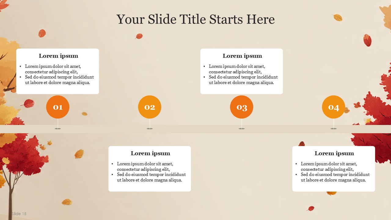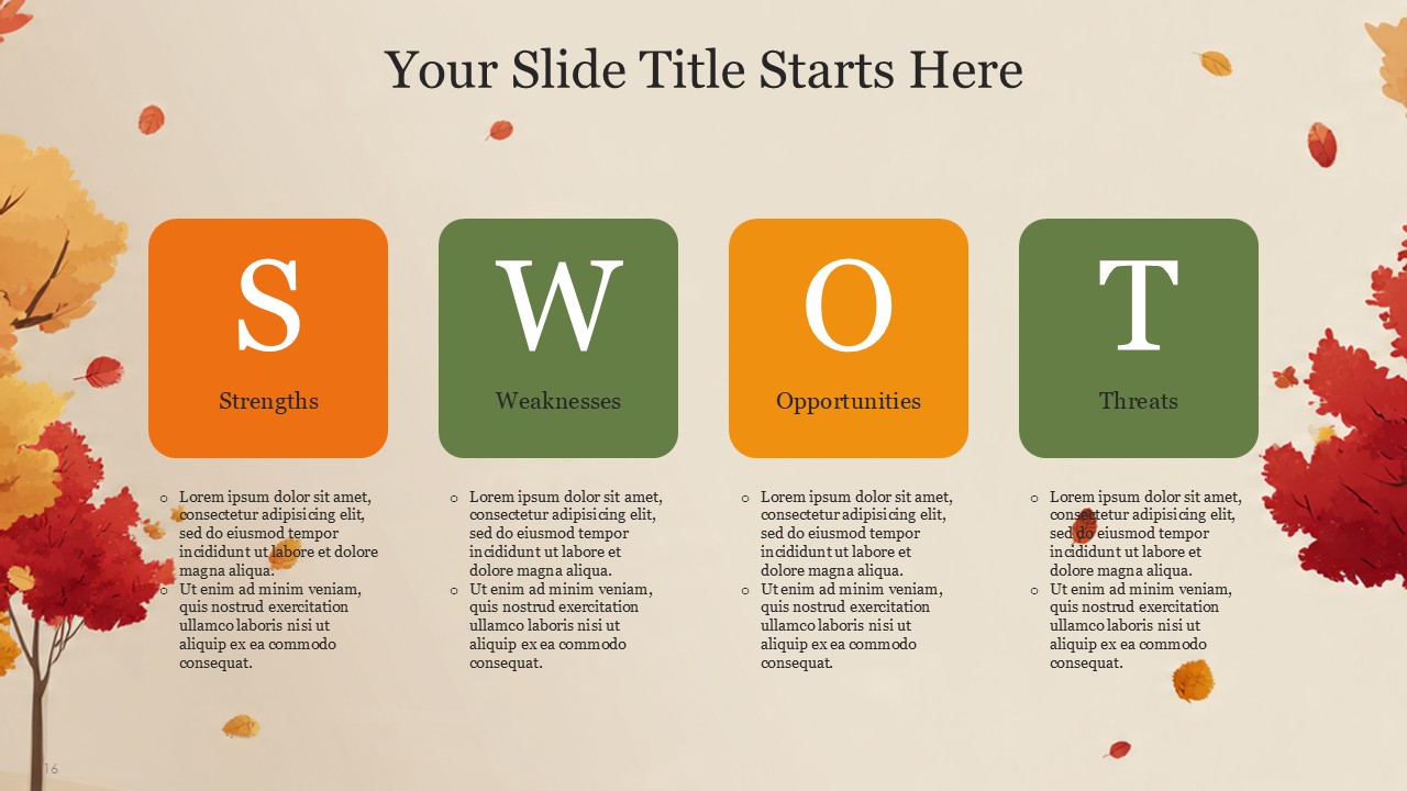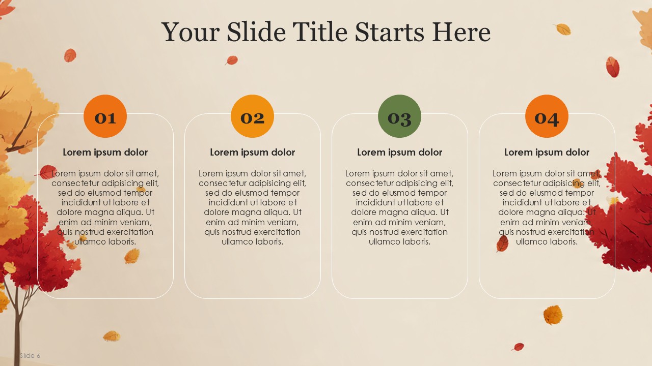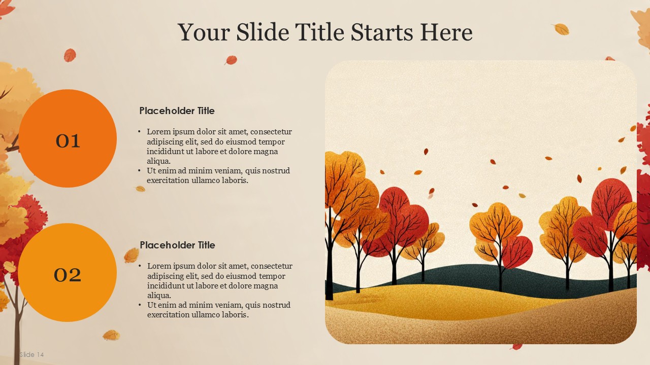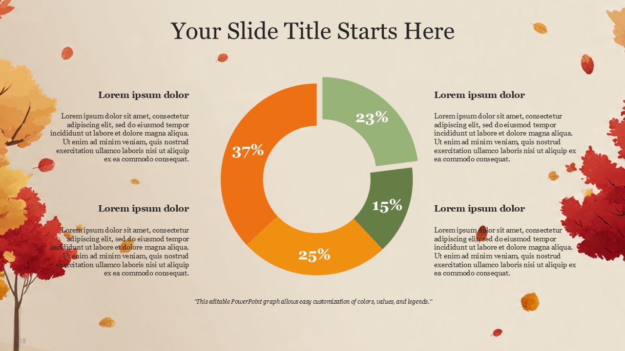 The Autumn PowerPoint Template comes with 20 slides which incorporates the vibrant autumn colors with a professional yet cozy design which balances the orange, yellow, green, and cream palette of autumn. This design template captures the essence of Autumn and transforms it with a fall theme, making is suitable for educational, personal, or business presentations. This design template is suitable for marketers, seasonal team leaders, teachers, and event managers. The template is sure to keep the theme coherent while presenting a confident message with added style.
