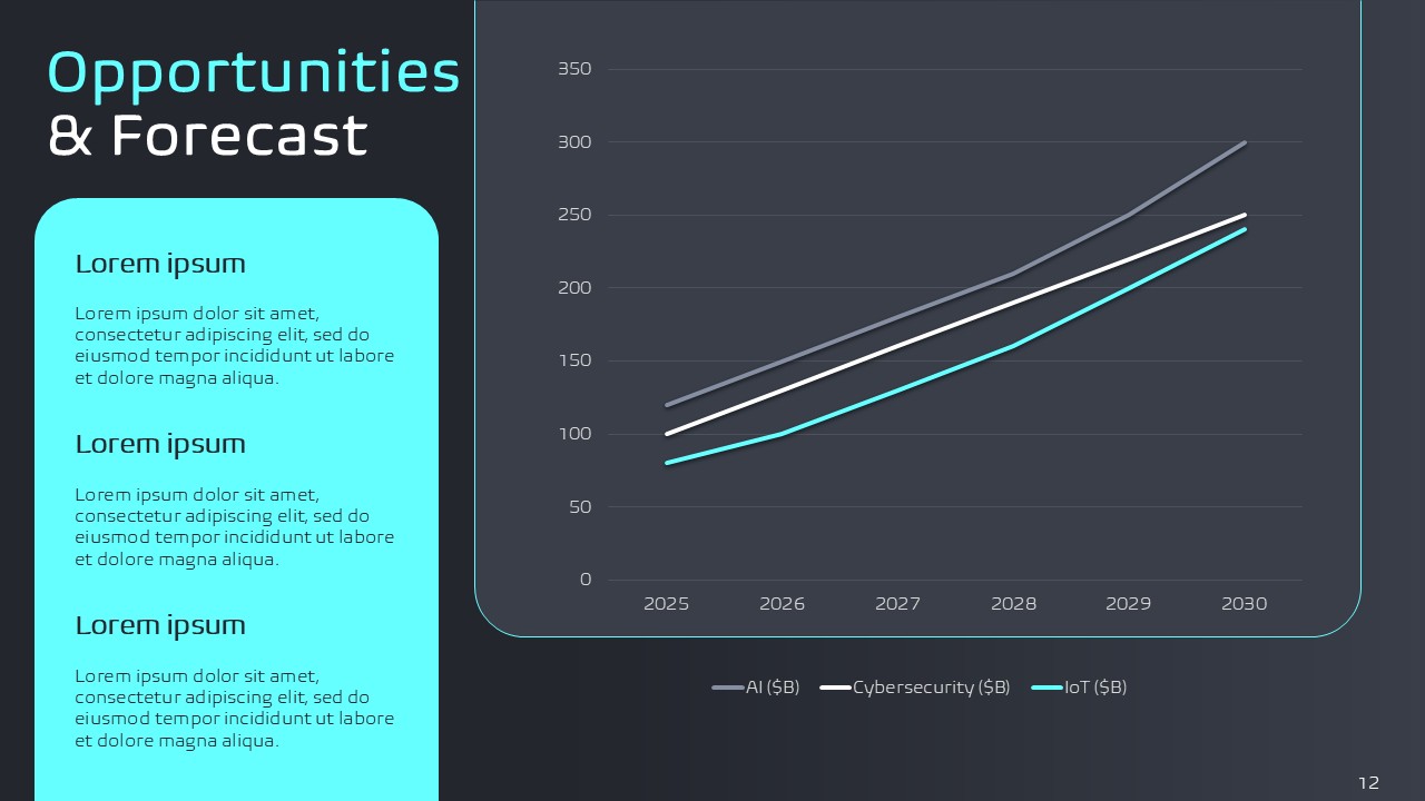 To convey technical credibility and reliability, grey represents sophistication and authority in a market while cyan conveys innovation and digital transformation. This strategy functions like a well-oiled machine. All grey backgrounds provide a neutral, technical canvas. The black type and heavy, black blocks of text provide focal points around feature specifications; and cyan, along with white text, highlight differentiators and competitive advantages. The geometric color application of the Information Technology Project Pitch Deck leverages this to capture a feeling that targets technical projects in a grounded and visionary manner.