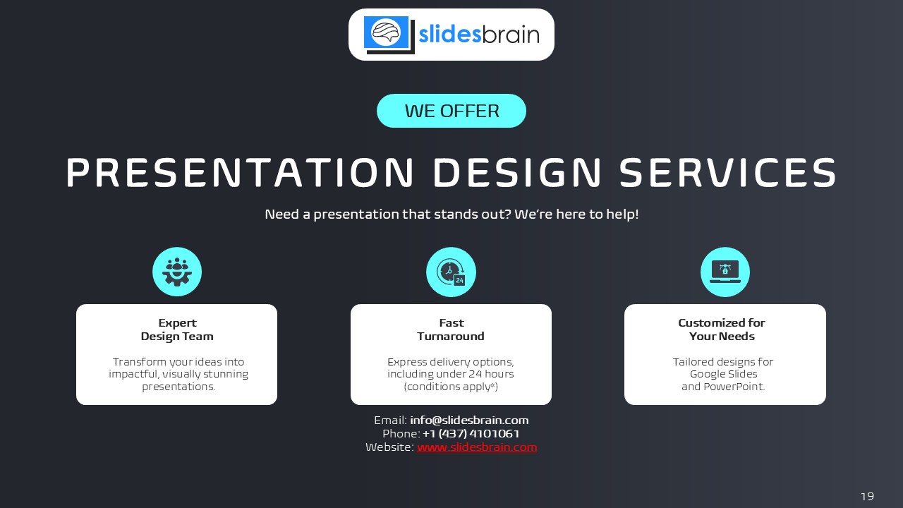 Looking for a slide or PPT that’s uniquely yours? Our presentation design agency is here to help make your ideas a reality. As a leading presentation design company, we focus on delivering premium-grade bespoke presentations that engage your audience and ensure message retention. Kindly get in touch with us for professional custom presentation design services and transform your brand’s message for the purpose that you have in mind.